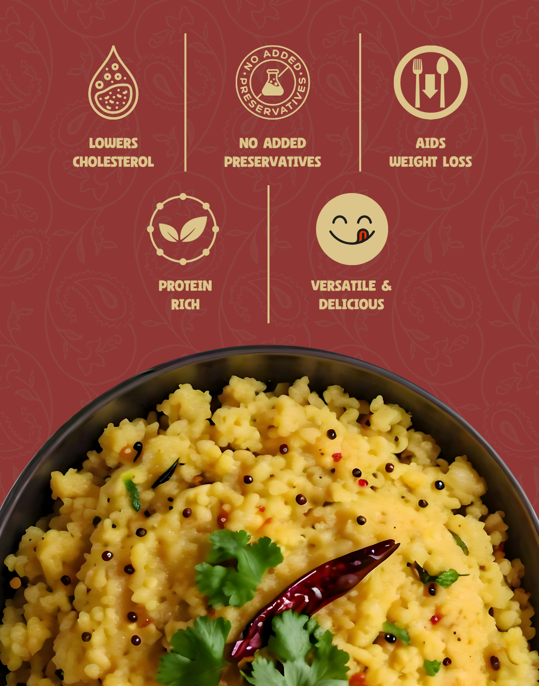 Enjoy the wholesome goodness of nutrient-rich kodo millet with lentils and spices in a quick, ready-to-cook mix. High in protein, fiber, antioxidants, and essential minerals, this low-glycemic, gluten-free meal supports digestion, heart health, weight management, and blood sugar control. Perfect for a comforting, satisfying meal anytime.