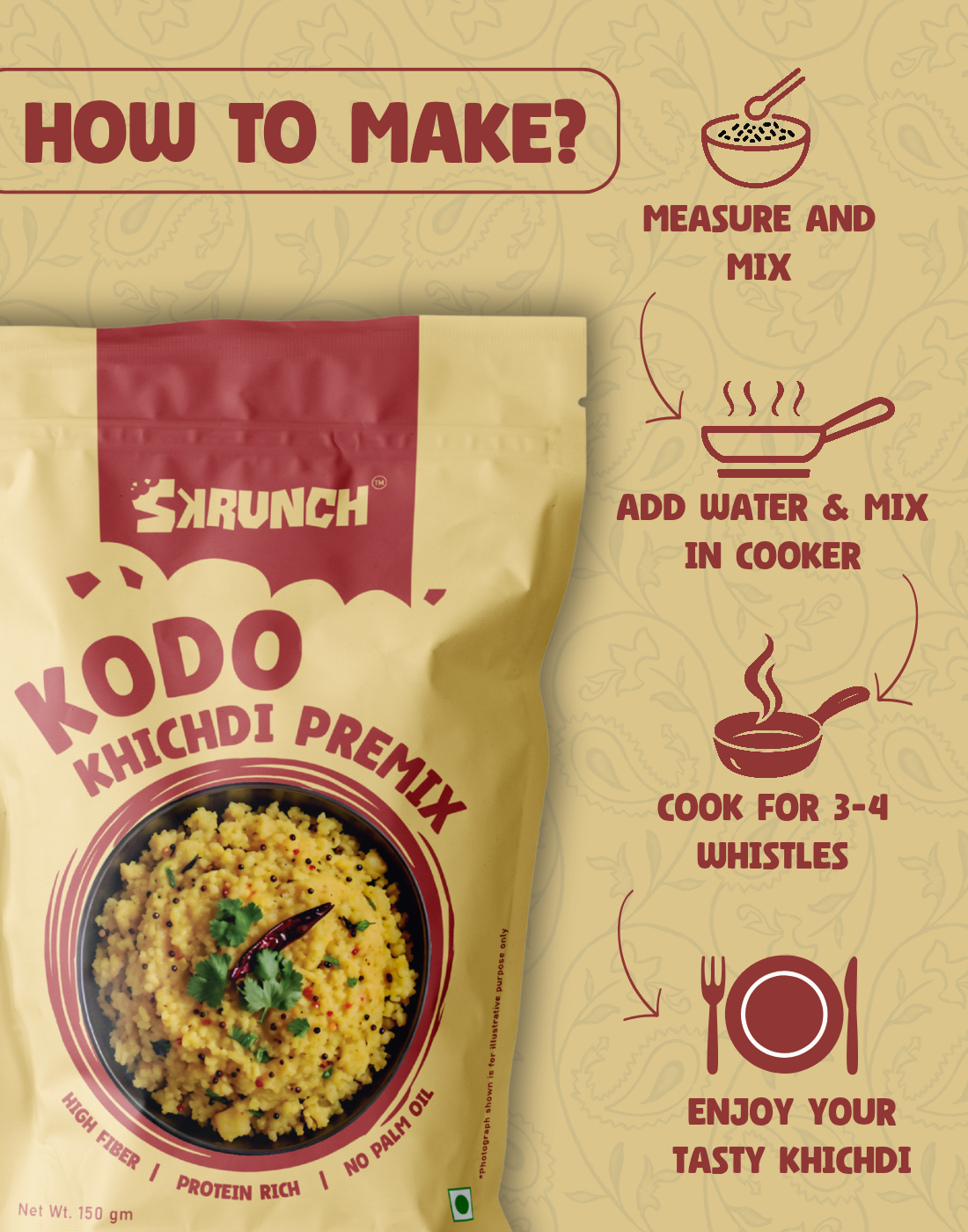 Measure and Mix: Open the Khichdi Mix, pour it into a cup, and measure 3 cups of water for every cup of mix.Cook in Cooker. Boil water in a cooker, add the mix (and Desi Ghee if desired), close the lid, and cook for 3-4 whistles on medium flame, then 2-3 minutes on low flame.Once cooked, your healthy khichdi is ready to eat.
