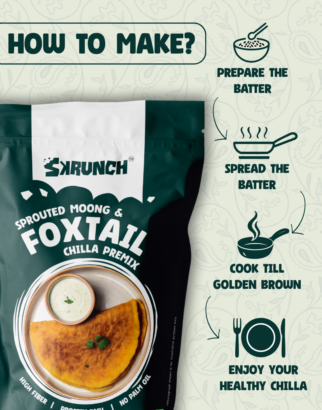 Prepare the Batter: Mix 1 cup of Chilla mix with 1 cup of water, stirring until lump-free, and let it soak for 10-15 minutes.Cook the Chilla: Heat a greased non-stick pan, spread the batter with a ladle, and roast on medium flame until golden brown. Repeat with remaining batter, and enjoy your healthy Chilla.