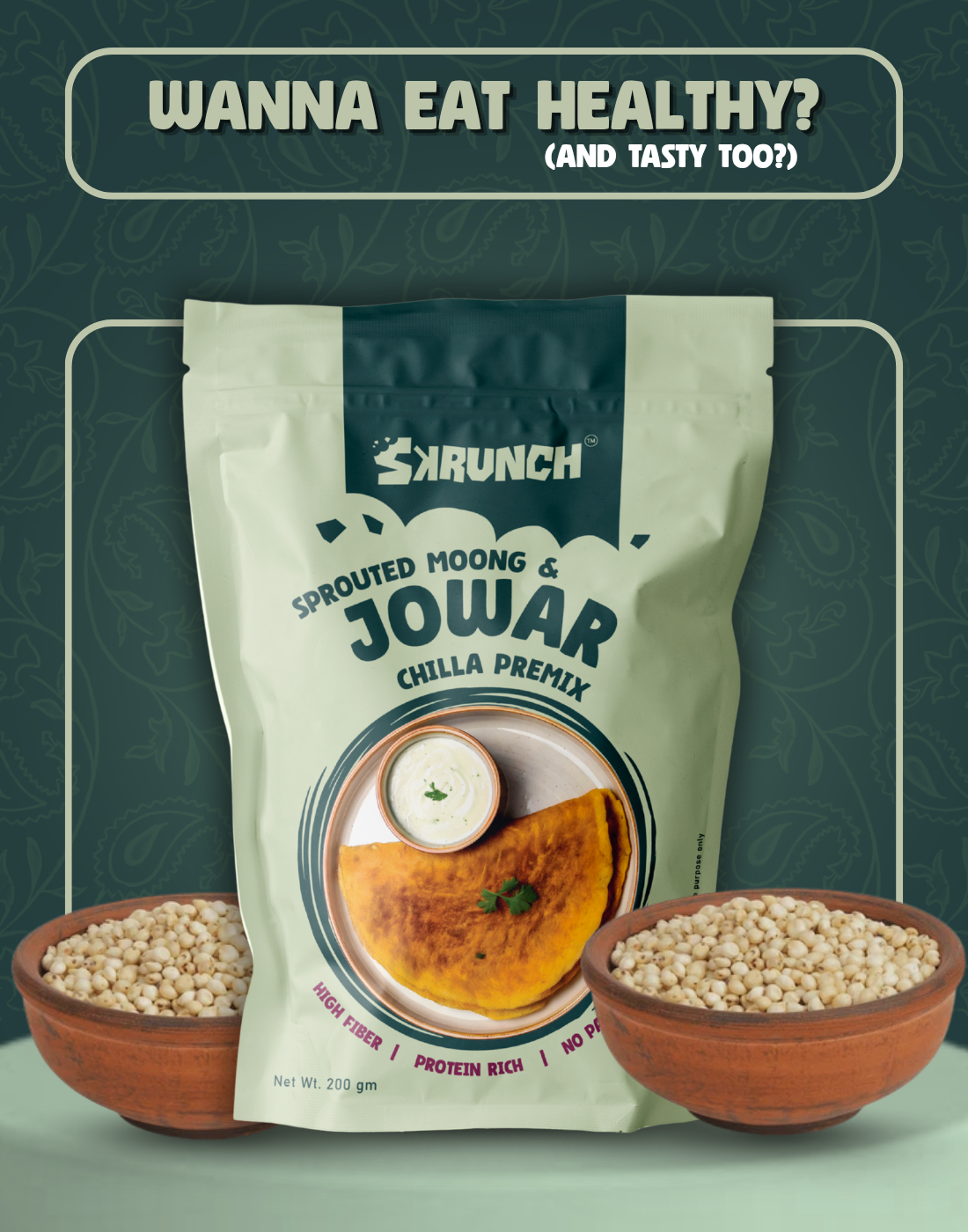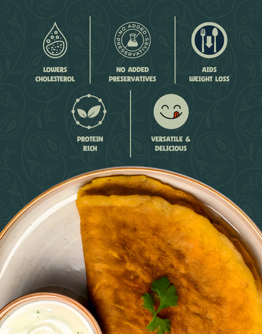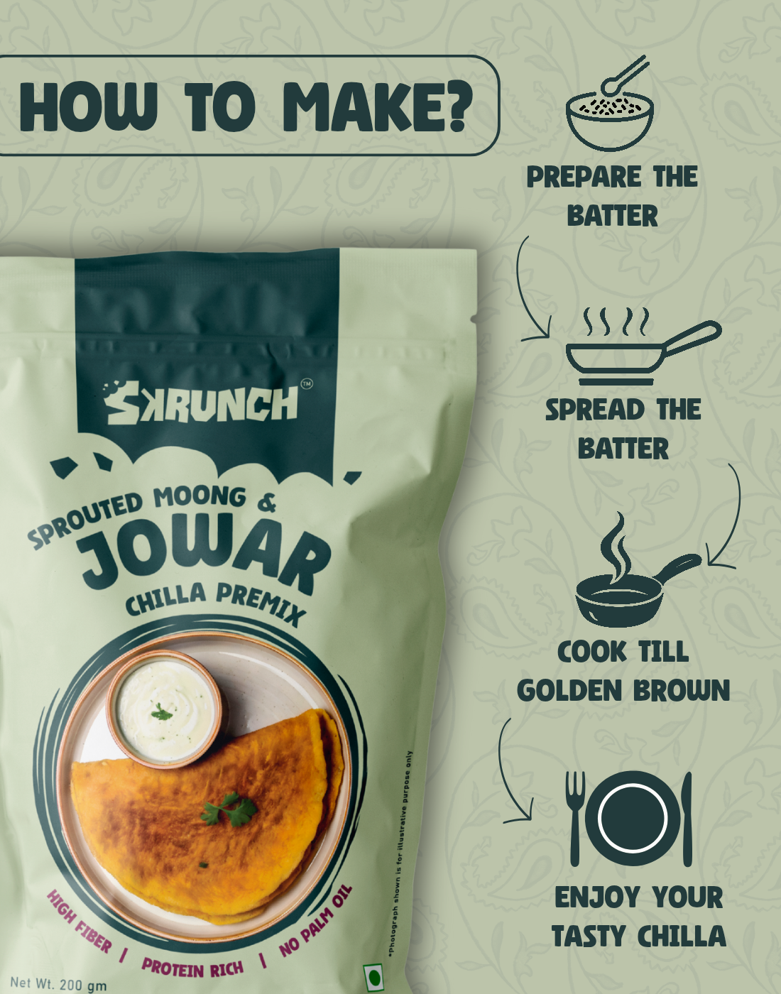 Enjoy protein-packed, fiber-rich chillas in minutes! Made with sprouted moong and nutrient-dense jowar, this gluten-free mix is easy to prepare, naturally spiced, and free from additives. Perfect for a healthy breakfast, lunch, or snack—just add water, cook, and enjoy.