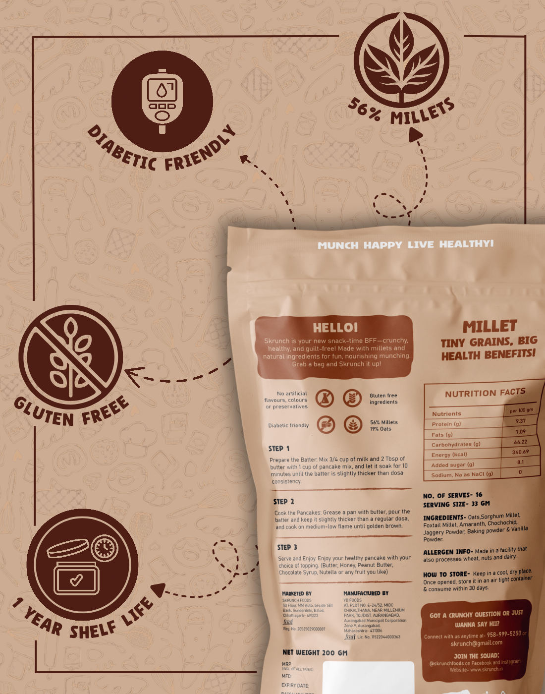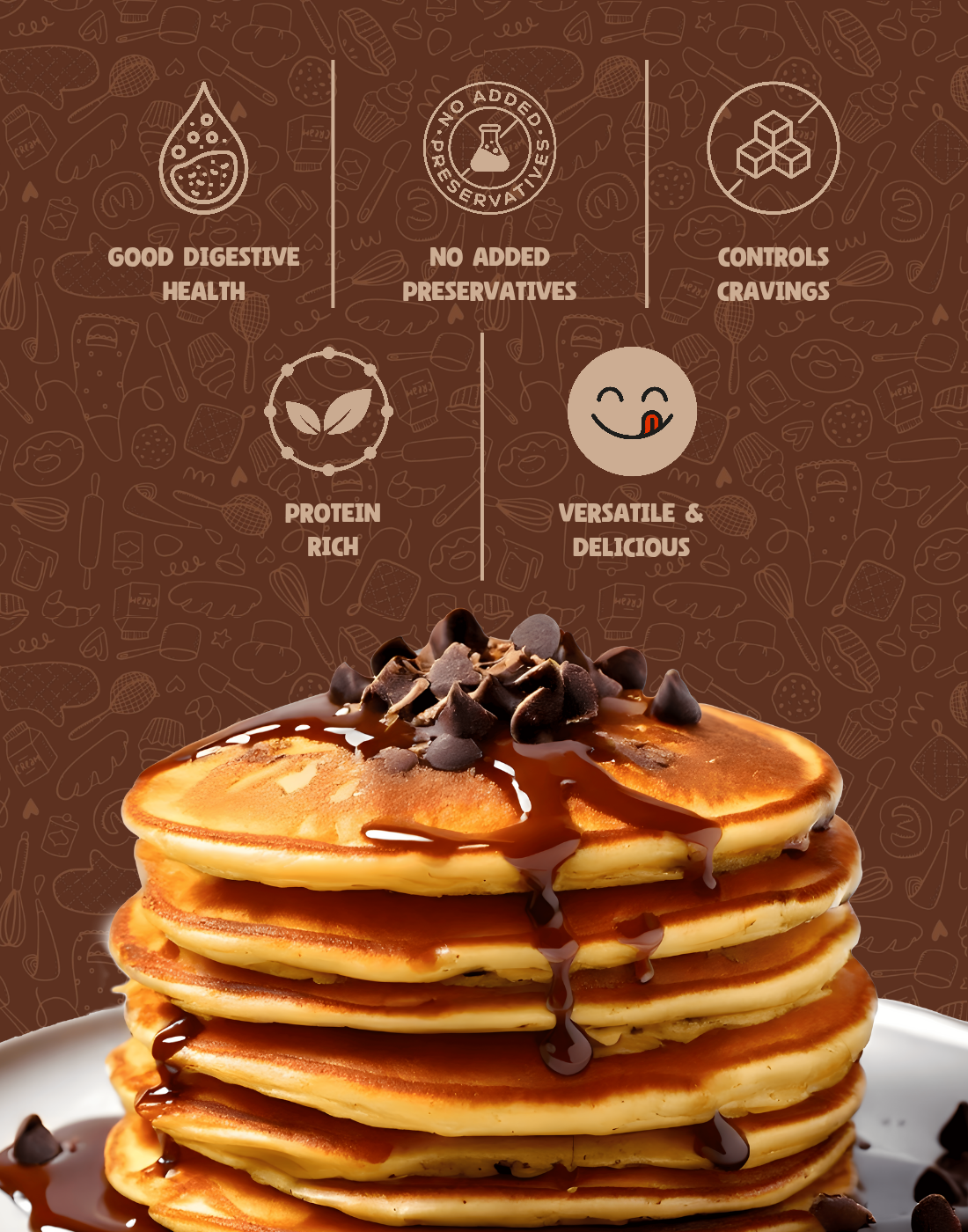Mix the Ingredients: Combine ¾ cup of milk and 2 Tbsp of butter with 1 cup of pancake mix, and let it soak for 10 minutes until the batter reaches a slightly thicker than dosa consistency.Grease a pan with butter, pour the batter thicker than a regular dosa, and cook on medium-low flame until it turns brown. Enjoy your healthy pancake with your choice of topping. (Butter, Honey, Peanut Butter, Chocolate Syrup, or any fruit you like)